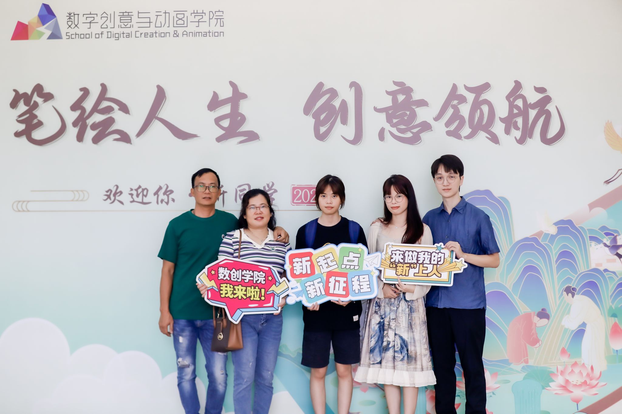 進(jìn)入數(shù)創(chuàng)學(xué)院迎新大廳,迎面看到的是“筆繪人生,創(chuàng)意領(lǐng)航”的立牌和學(xué)院師生原創(chuàng)的《糖果總動員》動畫片角色造型雕塑,讓新生們瞬間感受到了獨(dú)特的學(xué)院文化氣息。迎新現(xiàn)場還將“潮汕家風(fēng)家訓(xùn)”展覽現(xiàn)場布置為家長休息區(qū),讓新生家長在休息的同時也能領(lǐng)略到數(shù)創(chuàng)學(xué)院實(shí)訓(xùn)空間濃濃的文化氛圍。