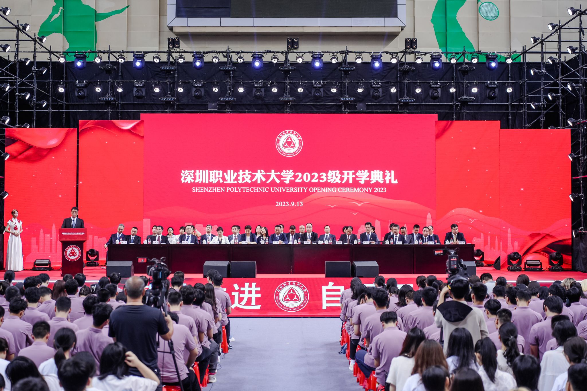 9月13日,深圳職業技術大學2023級新生開學典禮在西麗校區體育館舉行。學校校長許建領,黨委副書記、紀委書記王慧,副校長李月、李小元、張作泰出席典禮。各二級學院、各職能處室負責人,教師代表、班主任代表、新生輔導員代表和2023級3000余名新生代表現場參會。其余新生通過微信視頻號、嗶哩嗶哩網站線上同步觀禮。典禮由副校長董朝君主持。