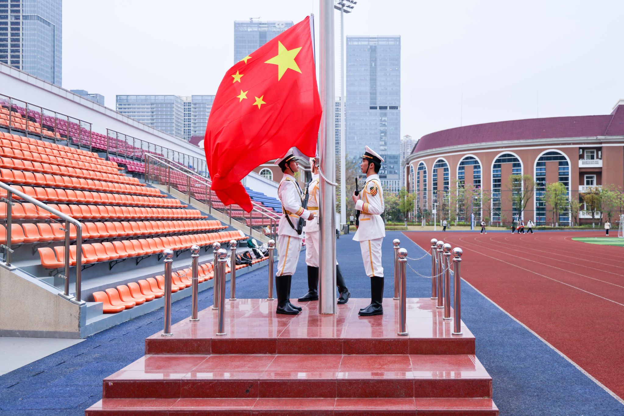 7:30,升旗儀式正式開始。在雄壯的國歌聲中,國旗班隊員滿懷激情地將莊嚴的五星紅旗升上校園上空,全場師生懷著激動與喜悅的心情,凝望五星紅旗冉冉升起,一同感受莊嚴時刻。