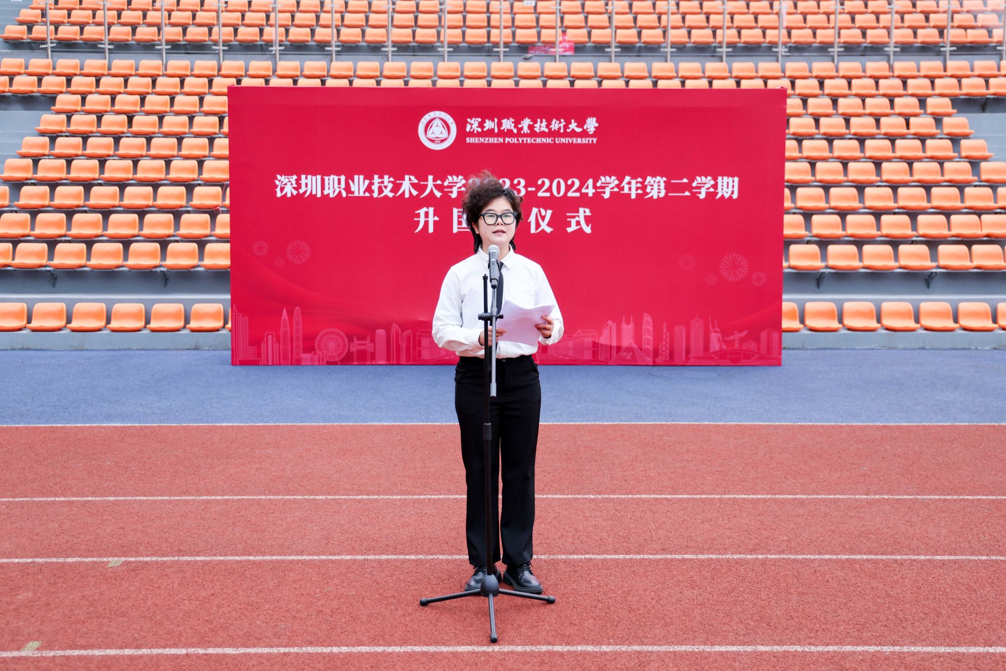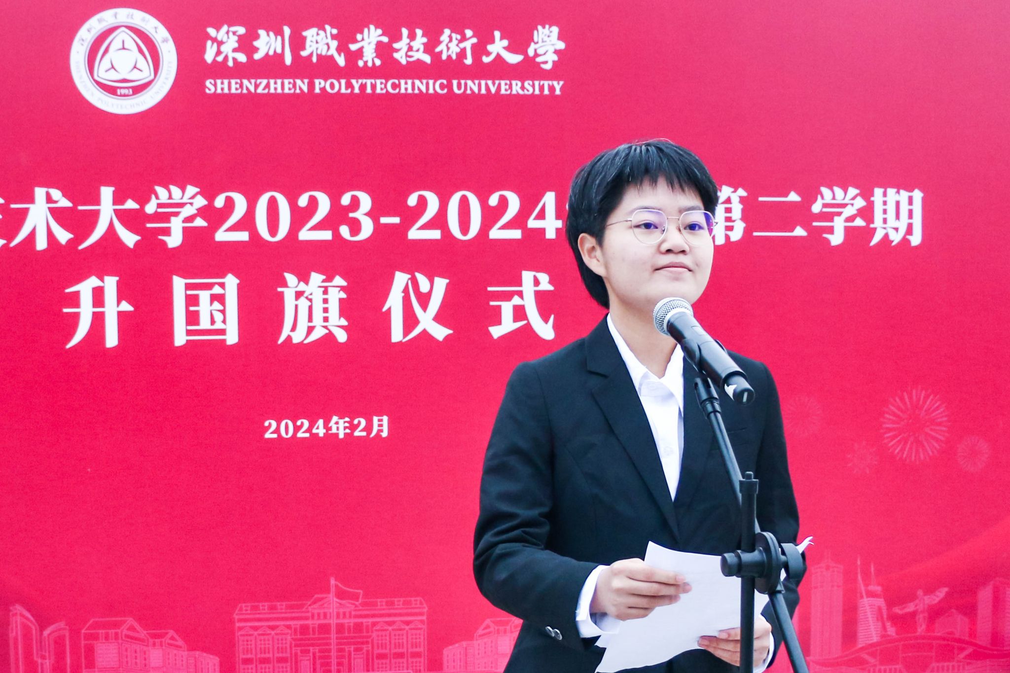 緊接著,未來技術學院2023級電子信息工程技術專業本科生張家艷、材料與環境工程學院2021級分析檢驗技術專業滕來儀作為學生代表進行了國旗下演講。2023年,張家艷以優異的成績考入深職大,懷著對大學學習生活的美好期待,她刻苦學習、勇于擔當,在課堂、社會實踐中不斷錘煉本領、增長才干。她向全體同學倡議:以飽滿的熱情迎接嶄新的學期,以昂揚的斗志追求卓越的成績,以積極的態度創造精彩的人生,共同迎接未來的挑戰,書寫青春的華章。滕來儀介紹了她參加首屆全國大學生職業規劃大賽,在一步一個腳印的努力中獲得大賽廣東省排名第一成績的心路歷程。她號召同學們在困難和挑戰面前保持冷靜、在失敗面前不屈不撓、在成功面前保持謙遜,將個人的理想追求融入國家發展之中,為祖國、為人民貢獻青春力量。