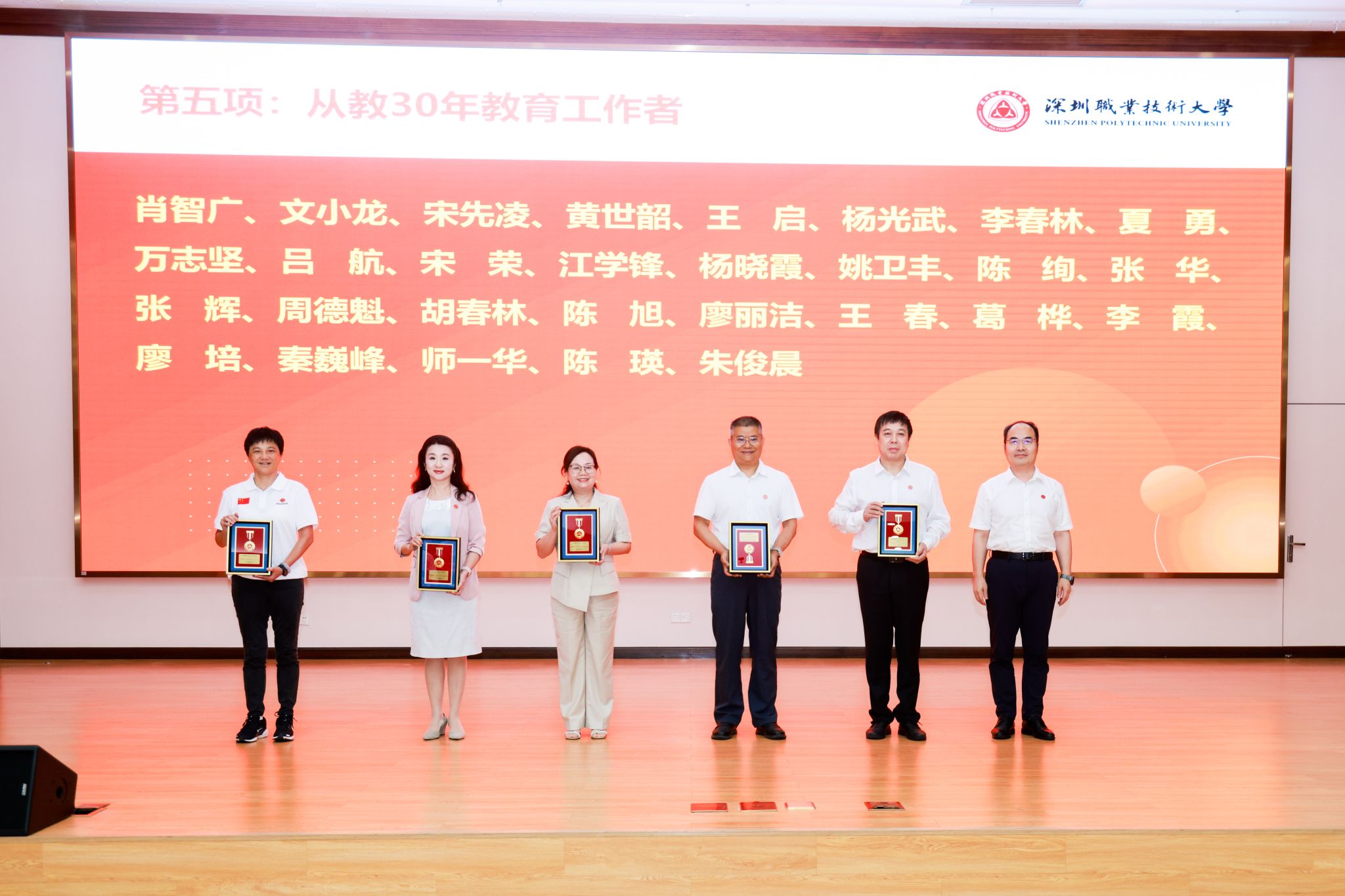校領導為5名從教30年教育工作者代表頒發紀念章。