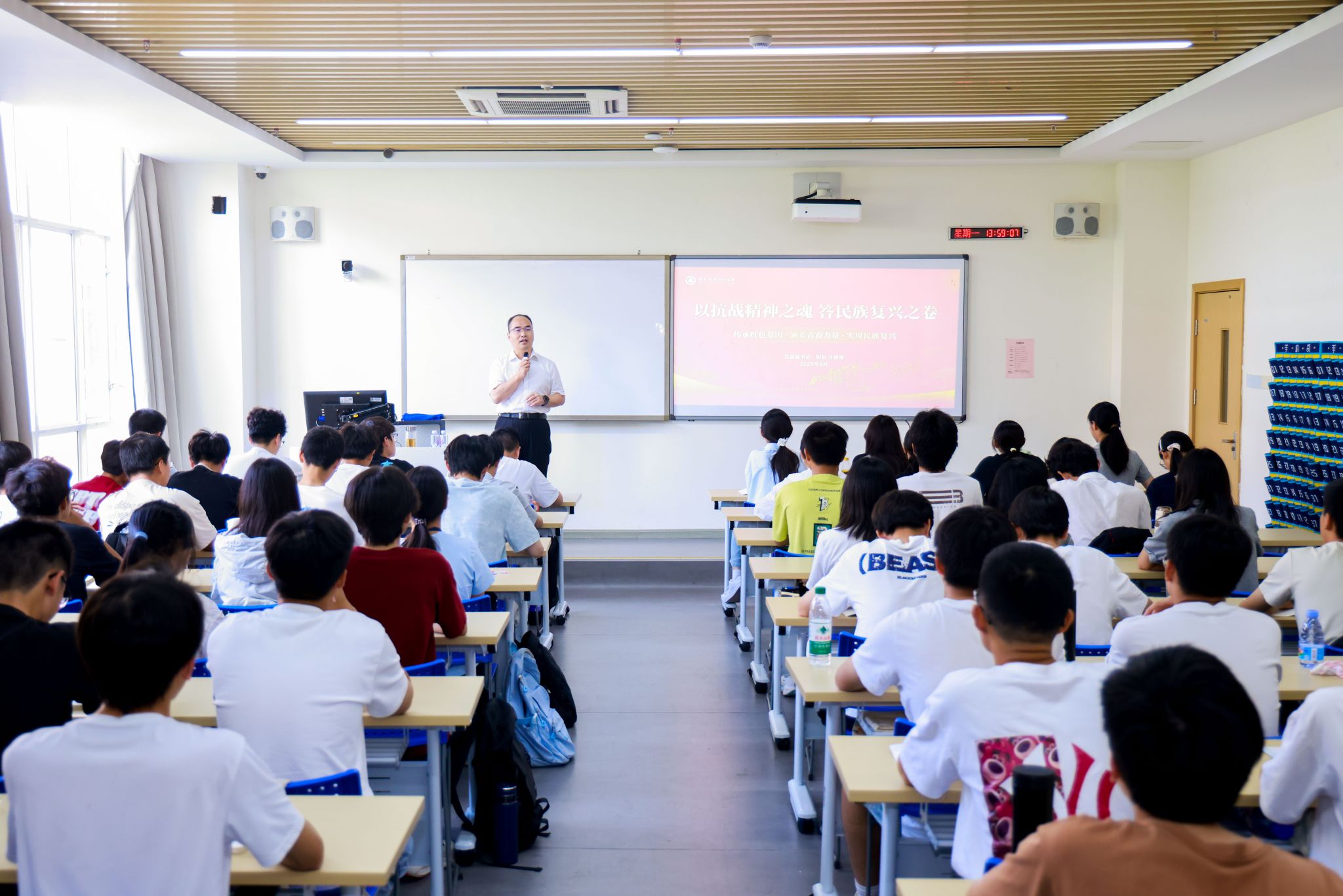 隨后,許建領(lǐng)從“歷史之魂”“時代之卷”“青年擔(dān)當(dāng)”三個方面詮釋了“以抗戰(zhàn)精神之魂 答民族復(fù)興之卷”的主題。他帶領(lǐng)同學(xué)們回顧歷史,從十四年艱苦卓絕的抗戰(zhàn)歷程中汲取偉大抗戰(zhàn)精神的磅礴力量;洞察時代,在國內(nèi)外形勢與深圳范例中找準(zhǔn)青春建功的奮斗坐標(biāo);指引未來,于時代浪潮中明確個人成長與民族復(fù)興相結(jié)合的前進(jìn)方向。